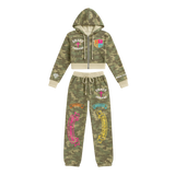 This two-piece camo set includes a cropped zip-up hoodie and matching high-waisted sweatpants with a relaxed, straight-leg fit. Designed for comfort and style, it brings a fresh Y2K-inspired take on the classic army fatigue pattern.