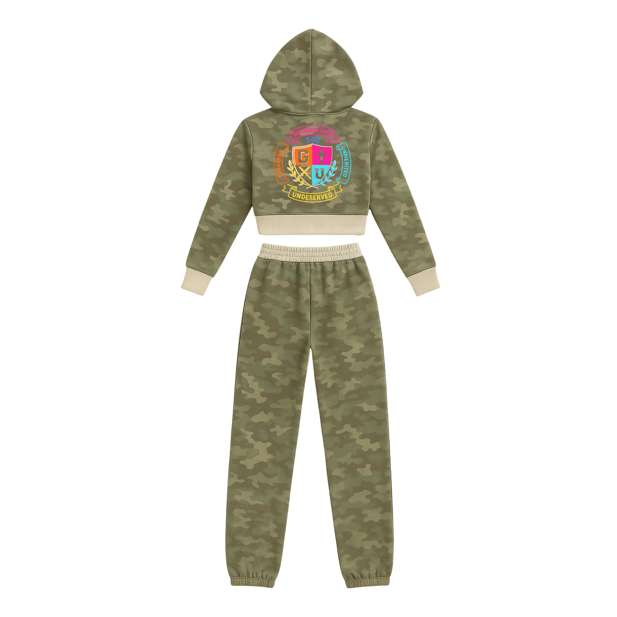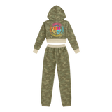 Wear the cropped hoodie on its own with jeans or leggings, or style the full set together for a clean, coordinated look. The camo pattern adds edge while the relaxed silhouette keeps the vibe effortlessly cool.