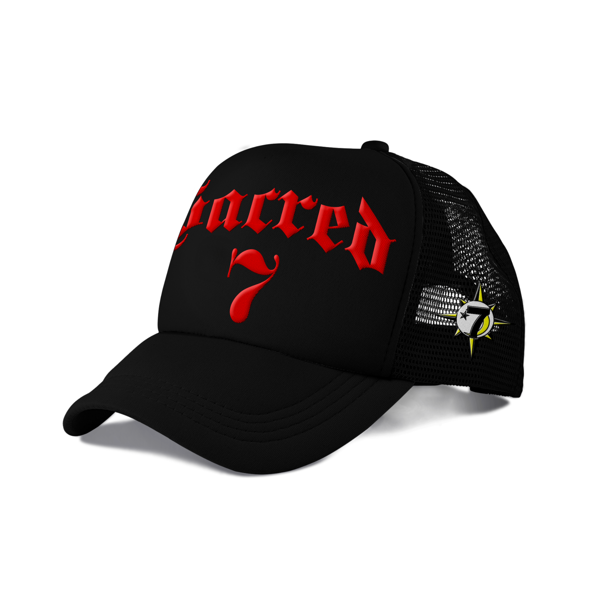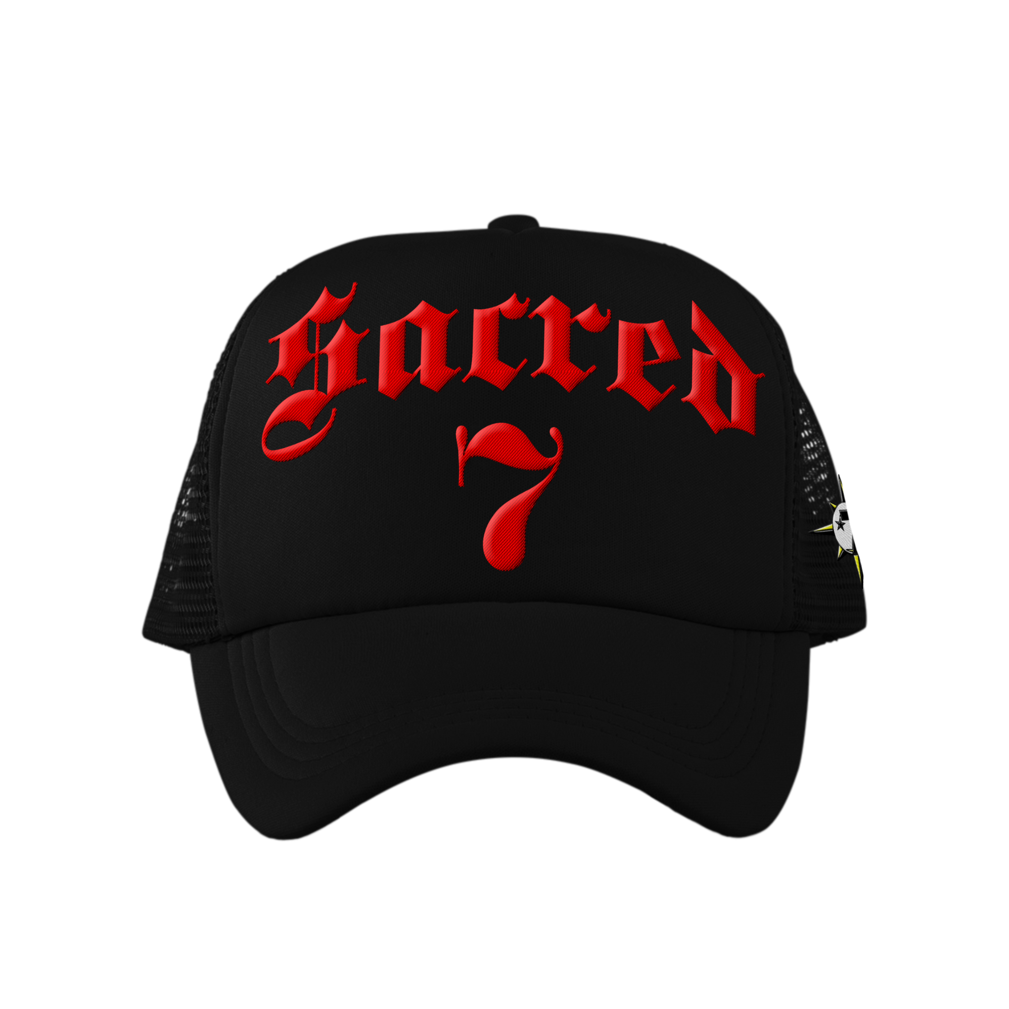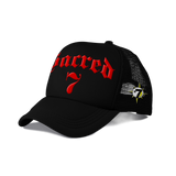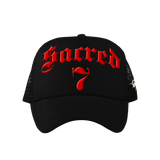 Sacred 7 Embroidered Trucker - Black On Red